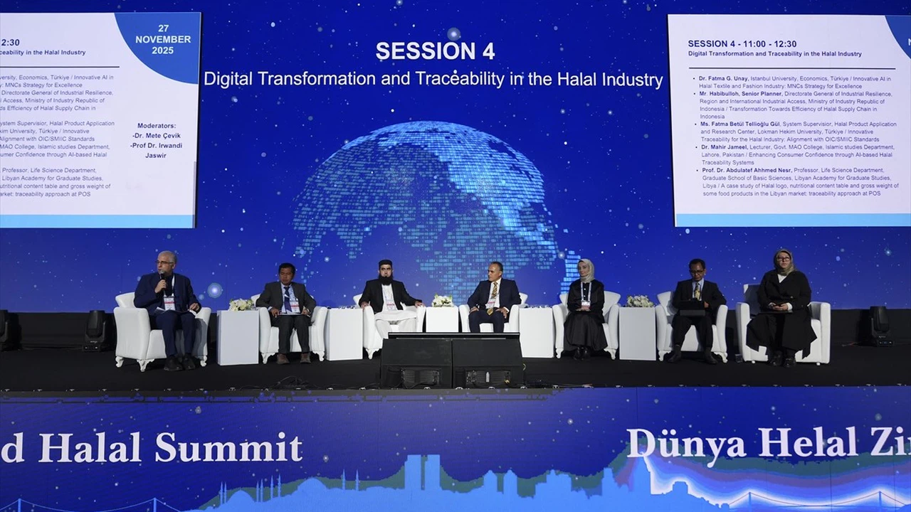 Cumhurbaşkanlığı himayelerinde, İslam İşbirliği Teşkilatının (İİT) ilgili kuruluşu İslam Ülkeleri Standartlar ve Metroloji Enstitüsü (SMIIC) işbirliğinde, Ticaret Bakanlığı ve Helal Akreditasyon Kurumu koordinasyonunda gerçekleştirilen Anadolu Ajansının Global İletişim Ortağı olduğu, 11. Dünya Helal Zirvesi ve Helal Expo Uluslararası Ticaret Fuarı, ikinci gününde devam ediyor. "Helal Endüstrisinde Dijital Dönüşüm ve İzlenebilirlik" oturumuna katılan İbn Haldun Üniversitesi'nden öğretim üyesi Dr. Fatma Genç Ünay (sağda), Lokman Hekim Üniversitesi Helal Ürün Uygulamaları ve Araştırma Merkezi Sistem Yöneticisi Fatma Betül Tellioğlu Gül (sağ 3), Government M.A.O Graduate College'dan öğretim üyesi Dr. Mahir Jemaal (sol 4), Libya Lisansüstü Çalışmalar Akademisi öğretim üyesi Prof. Dr. Abdulatef Ahhmed Nesr (sağ 4) konuşma yaptı.