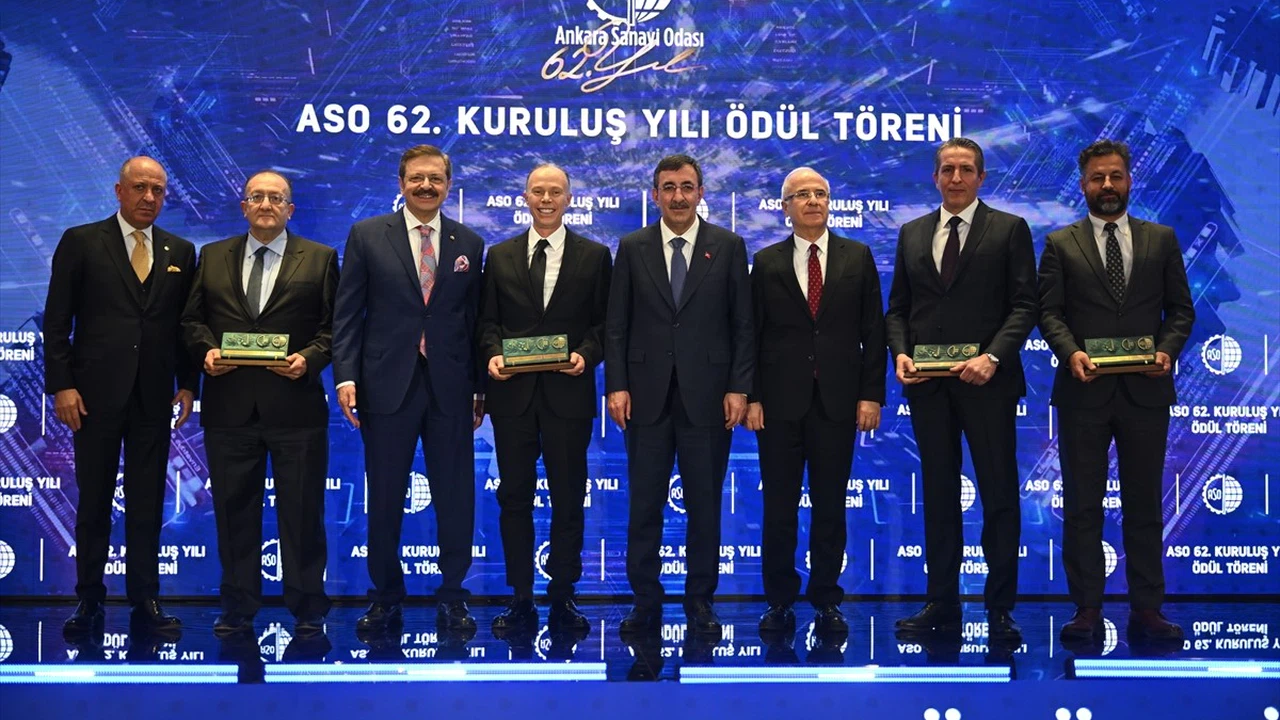 Ankara Sanayi Odası'nın (ASO) 62. kuruluş yıl dönümü dolayısıyla Ankara'da bir otelde düzenlenen ödül törenine Cumhurbaşkanı Yardımcısı Cevdet Yılmaz (sağ 4), TOBB Başkanı Rifat Hisarcıklıoğlu (sol 3), ASO Başkanı Seyit Ardıç (solda) ile Ankaralı iş insanları ve sanayiciler katıldı. ASO 62. Kuruluş Yılı Ödül Organizasyonu kapsamında, ihracat, istihdam, karlılık, AR-GE ve yenilik, ikiz dönüşüm olmak üzere 5 kategoride 28 sanayi firması ödüllendirildi.