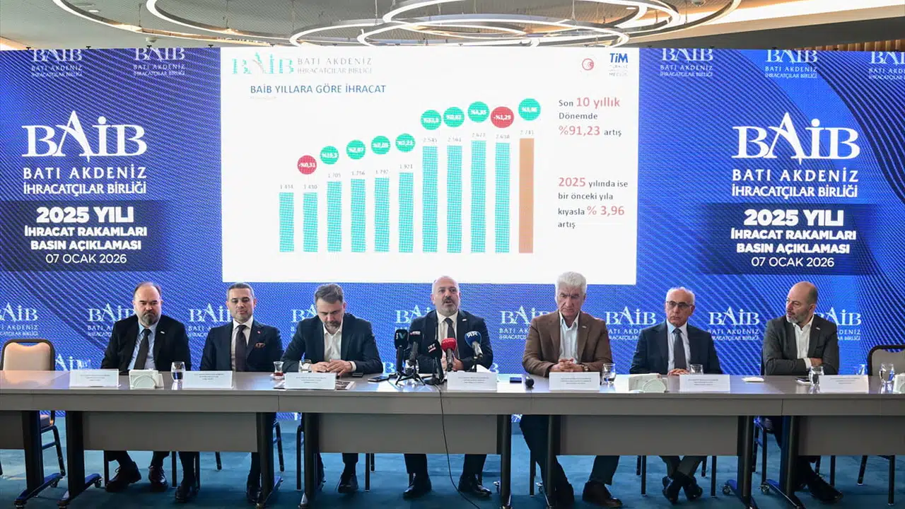 Batı Akdeniz İhracatçılar Birliği (BAİB) Yönetim Kurulu Başkanı Ümit Mirza Çavuşoğlu (ortada), Muratpaşa ilçesinde bir otelde düzenlediği basın toplantısında, sorumluluk alanı Antalya, Isparta ve Burdur olan BAİB'in geçen yılı ihracatta artışla kapattığını ve Birliğe üye firmalarca 2025 yılında 2 milyar 743 milyon dolarlık ihracat yapıldığını belirtti.