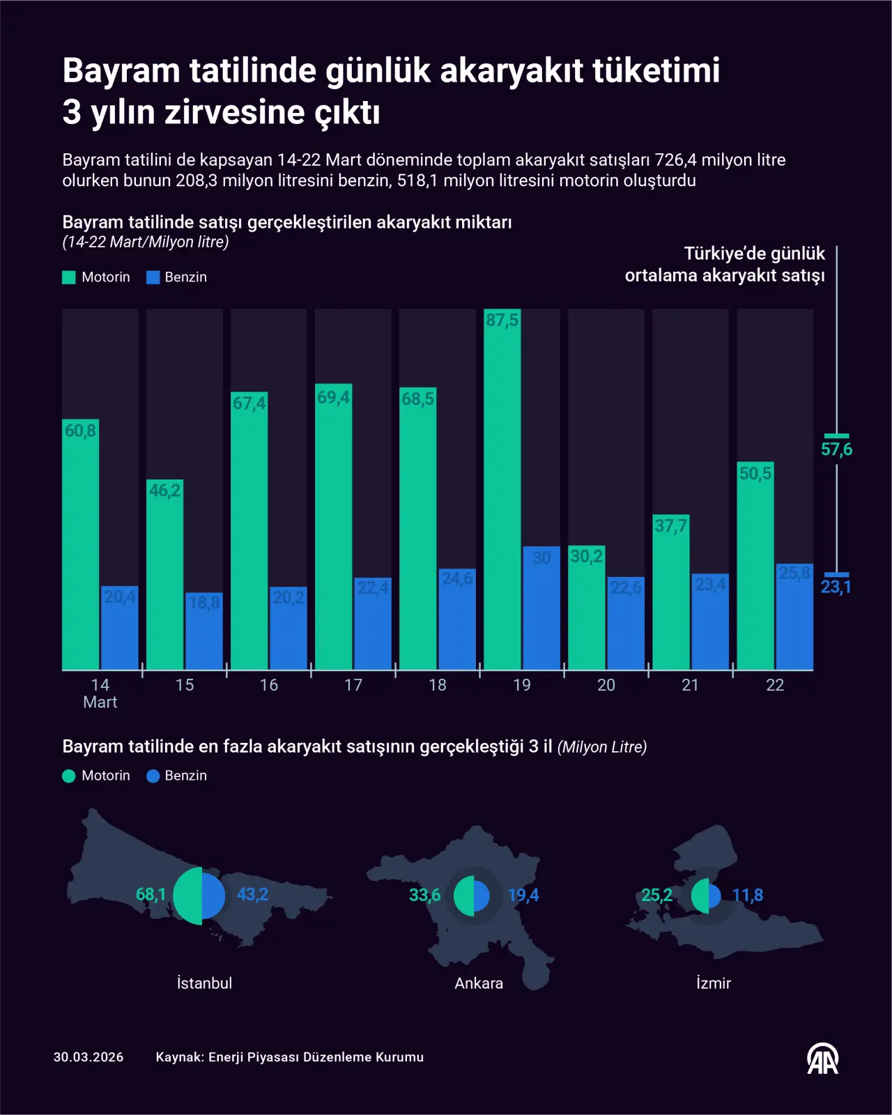 Türkiye’de Ramazan Bayramı tatilini kapsayan dönemde akaryakıt tüketimi günlük ortalamalarda son üç yılın en yüksek seviyesine çıktı. Enerji Piyasası Düzenleme Kurumu verilerine göre, 14-22 Mart tarihleri arasında toplam akaryakıt satışları 726,4 milyon litre olarak kaydedildi.