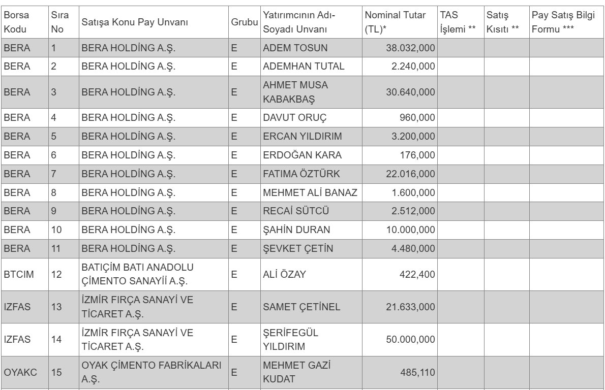 Kamuyu Aydınlatma Platformuna (KAP) yapılan açıklamaya göre, Sermaye Piyasası Kurulunun (SPK) VII-128.1 sayılı Pay Tebliği'nin 15. maddesi gereğince, pay senetleri borsada işlem gören ortaklıkların Kurul kaydında olan, ancak borsada işlem görmeyen statüde pay senetlerinin borsada satışa konu edilebilmesi amacıyla Merkezi Kayıt Kuruluşuna yapılan başvurulara ait bilgiler şöyle: