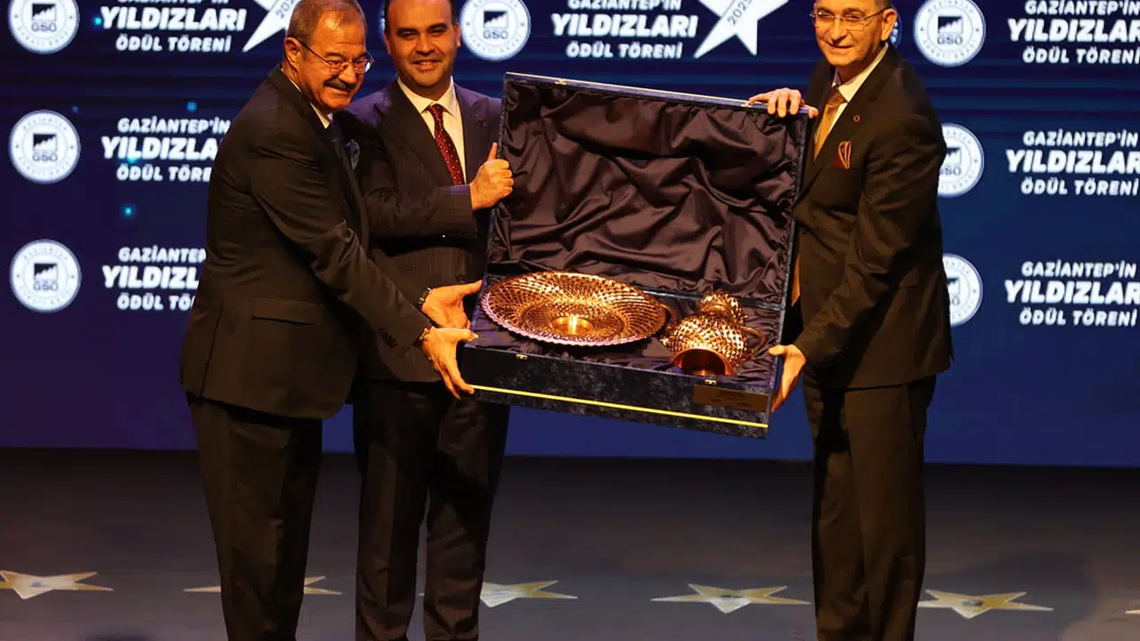 Sanayi ve Teknoloji Bakanı Mehmet Fatih Kacır, (ortada) Gaziantep Sanayi Odası tarafından düzenlenen "Gaziantep'in Yıldızları" ödül törenine katıldı. GSO Başkanı Adnan Ünverdi (sağda) Bakan Kacır'a hediye takdim etti.