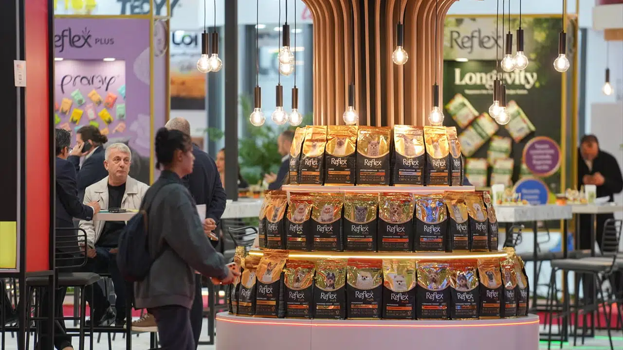 Türkiye 2025 yılında 112 ülkeye 103 bin ton kedi ve köpek maması ihraç etti. Bu ihracattan 150 milyon dolar gelir elde edildi. Fotoğrafta İzmir'de 8 Ocak'ta kapılarını açan Uluslararası İzmir Evcil Hayvan Ürün, Malzeme ve Aksesuar Tedarikçileri Fuarı (PET İZMİR) görülüyor.