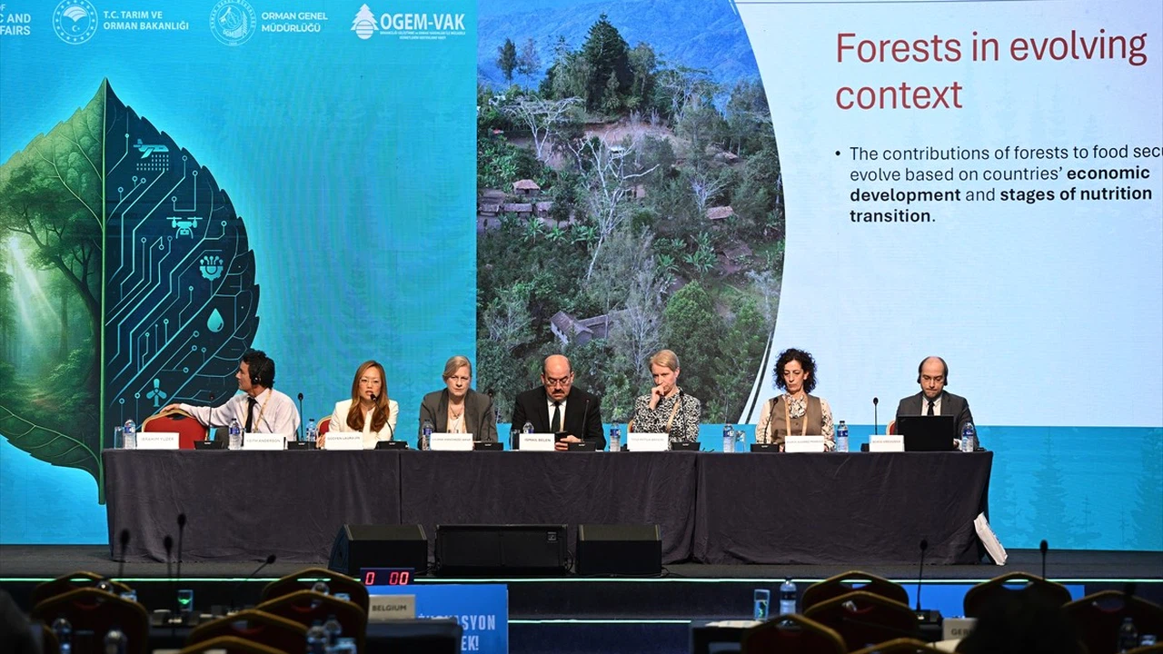 Anadolu Ajansının (AA) Global İletişim Ortağı olduğu, Orman Genel Müdürlüğü (OGM) koordinasyonunda, Birleşmiş Milletler Orman Forumu ile Gıda ve Tarım Örgütü (FAO) işbirliğiyle düzenlenen "Yeşil Vatan'dan Dünya Ormancılığına" temalı İstanbul Orman İnovasyon Haftası, dördüncü gününde de devam etti. "Ormanlar Dünyayı Nasıl Besliyor: Sağlıklı Ormanlar Aracılığıyla İnsanları Beslemek" konulu panele, İsviçre Federal Çevre Ofisi Kıdemli Danışmanı Keith Anderson (solda), Birleşmiş Milletler Avrupa Ekonomik Komisyonu (UNECE) Orman ve Biyoekonomi Bölümü Başkanı Liliana Annovazzi (sol 3), Birleşmiş Milletler Orman Forumu Başkanı İsmail Belen (sol 4), Finlandiya Tarım ve Ormancılık Bakanlığı Kıdemli Danışmanı Tiina Rytila (sağ 3), İspanya Ekonomik Değişim ve Demografik Mücadele Bakanlığı Uluslararası Orman Politikası Uzmanı Marta Alvarez Moreno (sağ 2), Slovakya Tarım ve Kırsal Kalkınma Bakanlığı Uluslararası Orman Politikalarından Sorumlu Baş Devlet Danışmanı Boris Greguska de (sağda) katıldı.