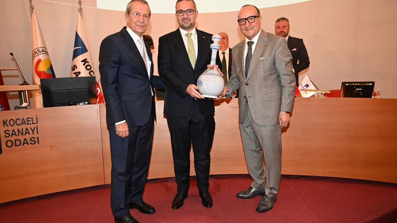 Kocaeli Sanayi Odasının (KSO) ekim ayı meclis toplantısı Türkiye Cumhuriyet Merkez Bankası (TCMB) Başkanı Fatih Karahan'ın (ortada) katılımıyla gerçekleştirildi. KSO Başkanı Ayhan Zeytinoğlu (sağda) ve KSO Meclis Başkanı Hasan Tahsin Tuğrul (solda), Karahan'a hediye takdim etti.