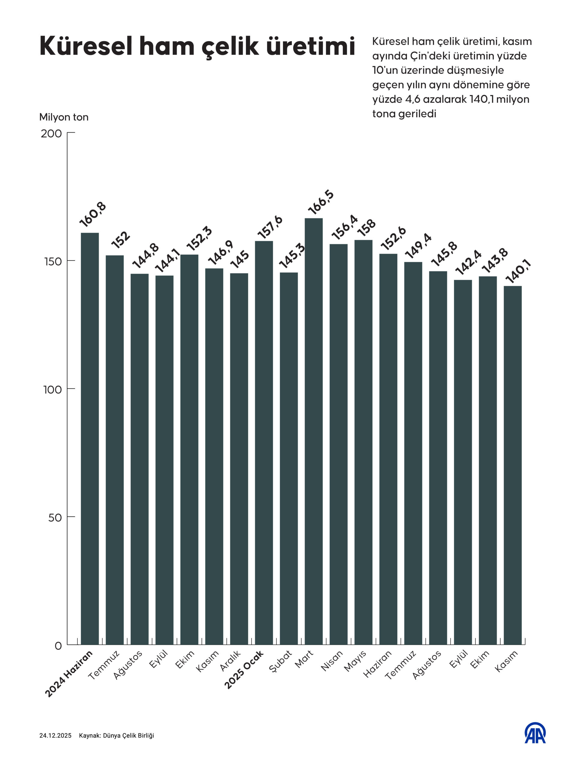 Söz konusu dönemde Brezilya'da yüzde 0,7 artarak 2,8 milyon tona çıkan çelik üretiminin, İran'da yüzde 9,2 artarak 3,4 milyon tona çıktığı tahmin edildi. Öte yandan, bu yılın ocak-kasım döneminde küresel ham çelik üretimi, 2024'ün aynı dönemine göre yüzde 2 azalarak 1 milyar 662 milyon tona geriledi. Aynı dönemde, Çin’in üretiminin yüzde 4 azalarak 891,7 milyon tona gerilemesi dikkati çekti.