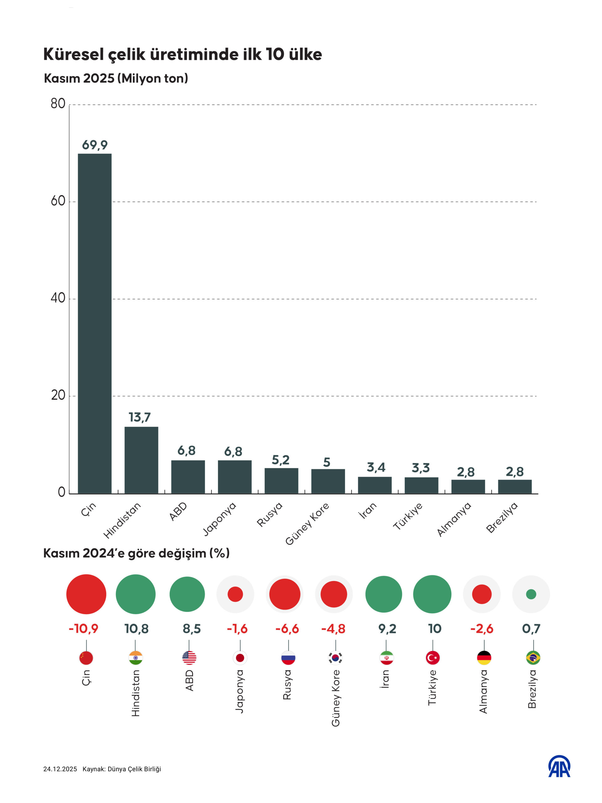 Buna göre, küresel ham çelik üretimi kasımda, 2024’ün aynı ayına kıyasla yüzde 4,6 azalarak 140,1 milyon tona geriledi. Geçen ay dünyanın en büyük çelik üreticisi konumundaki Çin'in üretimi, yüzde 10,9 azalarak 69,9 milyon tona düştü. Japonya'nın üretimi yüzde 1,6 azalarak 6,8 milyon tona inerken ABD'nin üretimi yüzde 8,5 yükselişle 6,8 milyon tona çıktı.