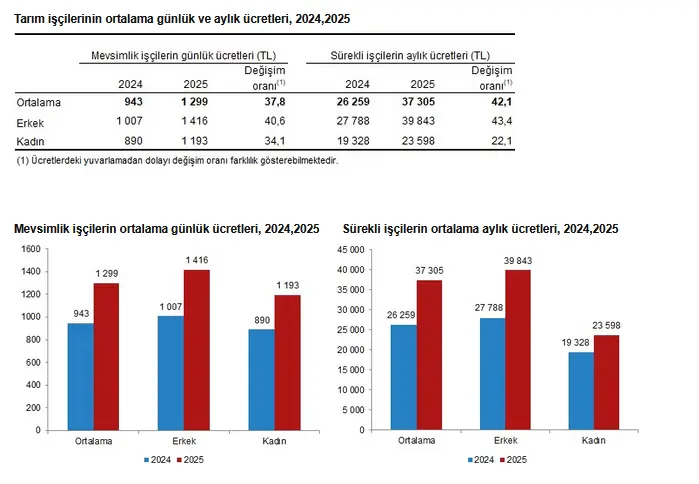 Türkiye İstatistik Kurumu’nun (TÜİK) verilerine göre, tarımsal işletmelerde 2025 yılında mevsimlik tarım işçilerinin günlük ücretleri bir önceki yıla göre yüzde 37,8 artarak 1 299 TL, sürekli tarım işçilerinin aylık ücretleri ise yüzde 42,1 artarak 37 bin 305 TL'ye yükseldi.