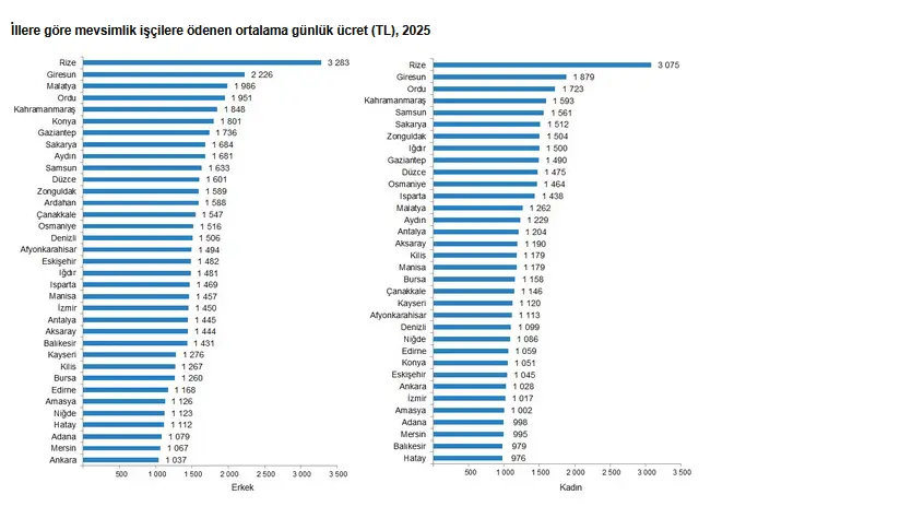 Tarımsal işletmelerde 2025 yılında mevsimlik tarım işçilerine yapılan en yüksek günlük ücret ödemesi erkek işçiler için 3 bin 283 TL, kadın işçiler için 3 bin 75 TL ile Rize'de gerçekleşti. En düşük ücret ödemesi ise erkek işçiler için 1 037 TL ile Ankara, kadın işçiler için ise 976 TL ile Hatay'da gerçekleşti.