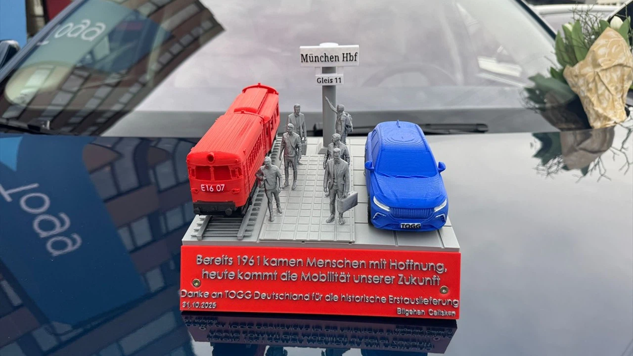 Almanya'da yerli otomobil TOGG'un ilk teslimat töreni gerçekleştirildi. Bu özel etkinlikte, Türk kökenli bir makine mühendisi olan Bilgehan Çalışkan, TOGG yetkililerine 1961 göçü ve geleceğin mobilitesi konusunu vurgulayan bir maket hediye etti.
