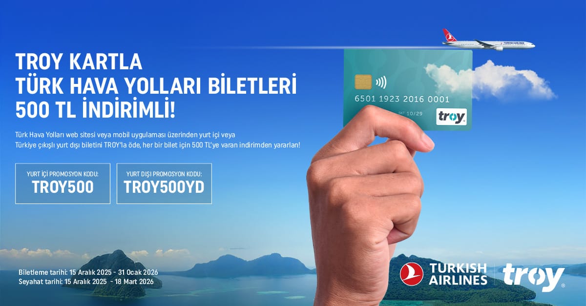 Türkiye’nin Ödeme Yöntemi TROY, Türk Hava Yolları iş birliğiyle TROY kart kullanıcılarına özel yeni bir kampanya başlattı. 15 Aralık 2025 – 31 Ocak 2026 tarihleri arasında geçerli kampanyada, her bir bilette 500 TL’ye varan indirim sunuluyor.