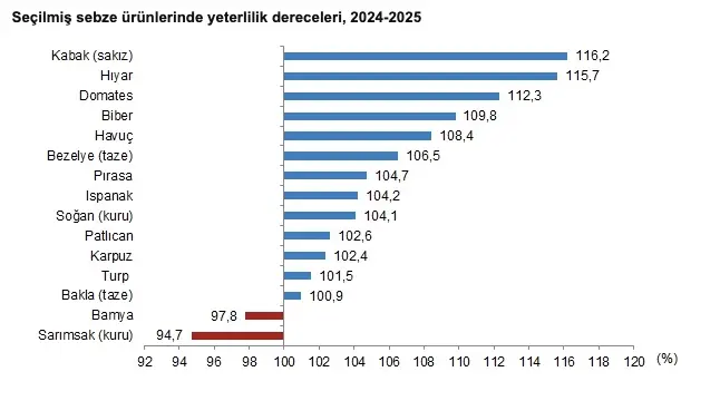 Sebze ürünleri toplamı için 2024-2025 piyasa döneminde yurt içi üretimin, yurt içi talebi karşılama derecesi yüzde 108,8 oldu. Sebzelerde en yüksek yeterlilik dereceleri sakız kabakta yüzde 116,2, hıyarda yüzde 115,7, domateste ise yüzde 112,3 olarak gerçekleşti.