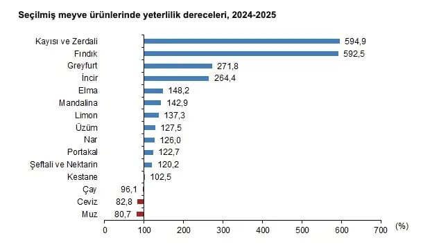 Meyveler ve içecek bitkilerinde 2024-2025 piyasa döneminde en yüksek yeterlilik derecesi yüzde 594,9 ile kayısı ve zerdalide gerçekleşti. Turunçgiller grubunda yer alan meyvelerin tamamında üretimin kendine yeterli olduğu görüldü. Yeterlilik derecesi çayda yüzde 96,1, muzda yüzde 80,7, cevizde yüzde 82,8 oldu.