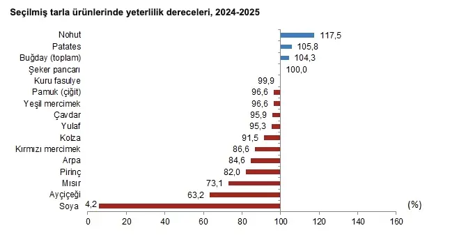 Türkiye İstatistik Kurumu’nun (TÜİK) verilerine göre,Tahıl ürünleri toplamı için 2024-2025 piyasa döneminde yurt içi üretimin yurt içi talebi karşılama derecesi (yeterlilik derecesi) yüzde 91,1 olarak gerçekleşti. Toplam tahıl üretiminde en büyük paya sahip olan buğdayın yeterlilik derecesi yüzde 104,3 (durum buğdayında yüzde 202,0, diğer buğdayda yüzde 92,3); yem sanayinin en önemli girdilerini oluşturan arpanın yeterlilik derecesi yüzde 84,6, mısırın yeterlilik derecesi yüzde 73,1, soyanın yeterlilik derecesi ise yüzde 4,2 olarak gerçekleşti