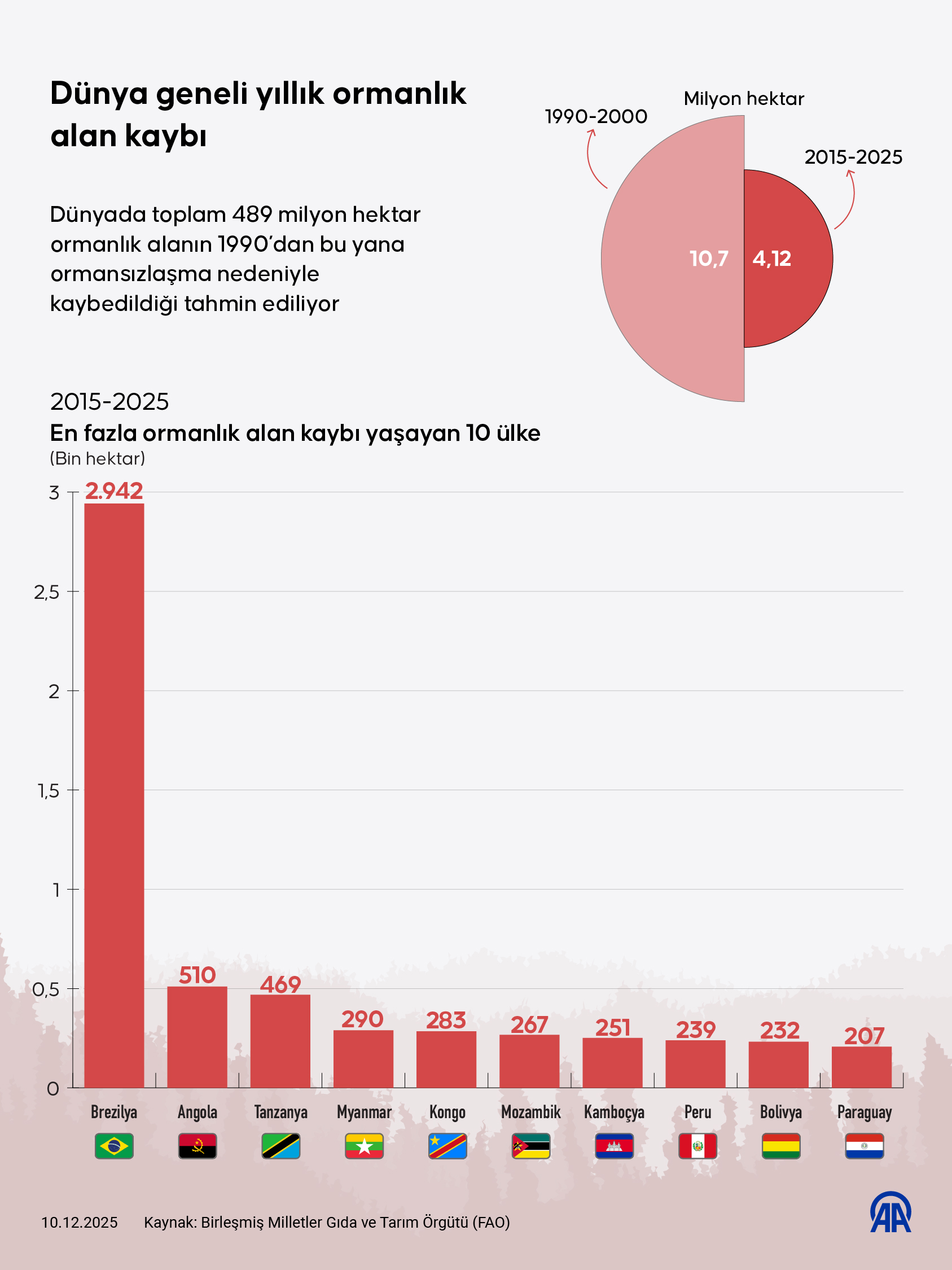 Brezilya, 2015-2025 yıllarında yılda ortalama 2 milyon 942 bin hektarlık kaybıyla dünyada en çok ormanlık alan kaybına uğrayan ülkeler arasında başı çekiyor. Bu dönemde, Angola yılda 510 bin hektar, Tanzanya 469 bin, Myanmar 290 bin, Kongo 283 bin, Mozambik de 267 bin hektar ormanlık alan kaybederek Brezilya’yı takip etti.