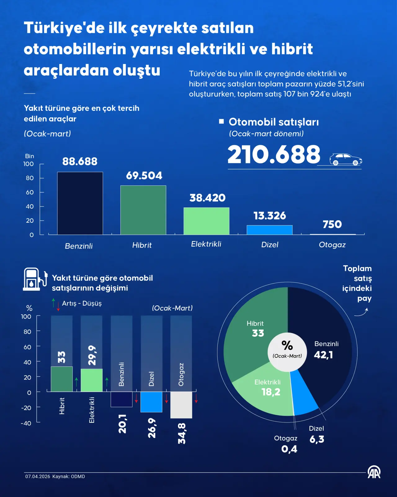 Yılın ilk çeyreğini kapsayan ocak-mart döneminde otomobil satışları, bir önceki yılın aynı dönemine göre yüzde 5,86 oranında bir azalış göstererek 210 bin 688 seviyesine geriledi. Hafif ticari araç pazarında ise otomobil pazarının aksine bir artış yaşandı. Hafif ticari araç satışları bu dönemde yıllık bazda yüzde 4,23 oranında artarak 54 bin 710 adet olarak gerçekleşti. Toplam pazardaki değişimler yakıt türlerine göre dağılımda daha belirgin bir şekilde kendisini gösterdi.