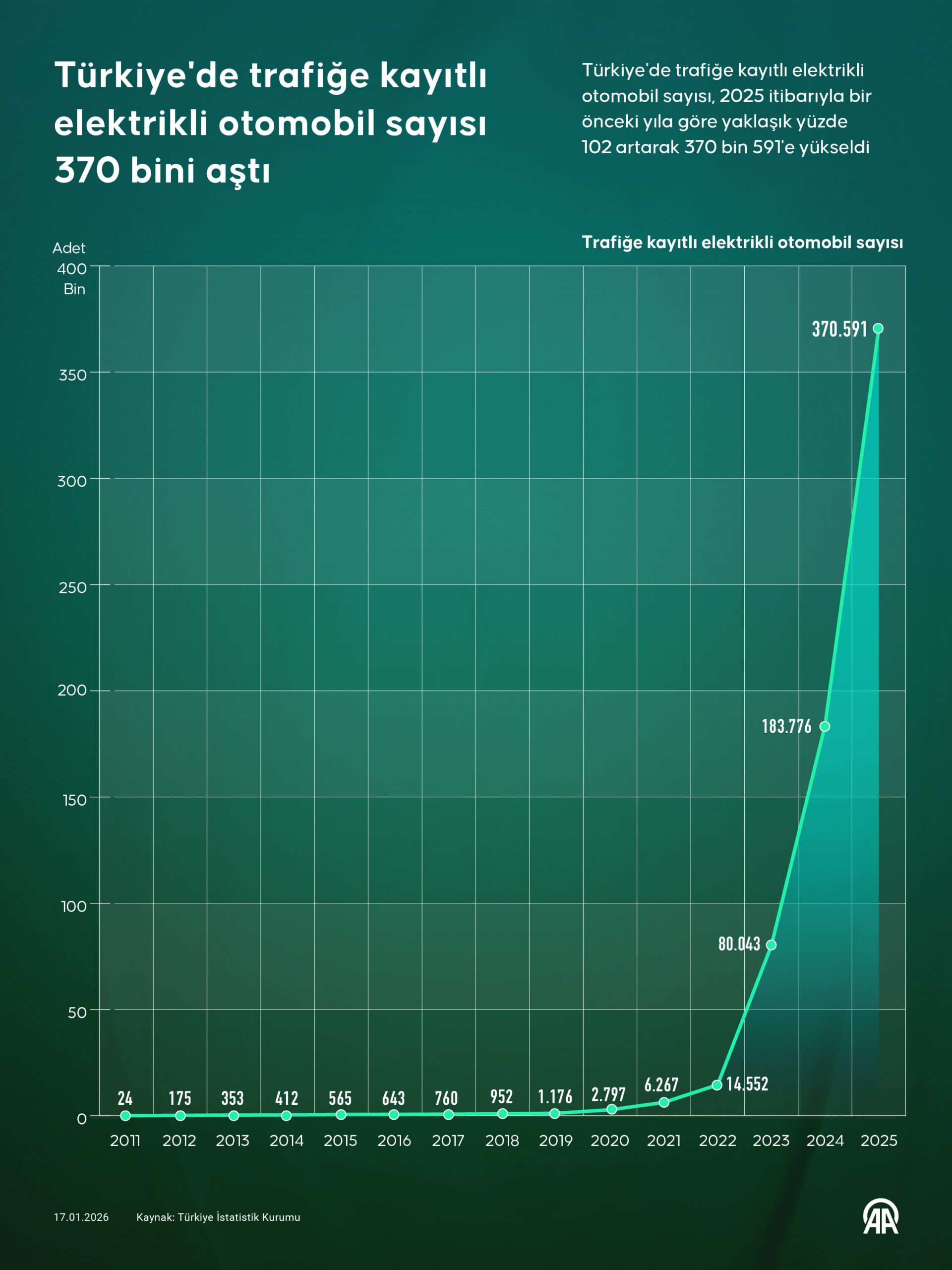 Türkiye'de trafiğe kayıtlı elektrikli otomobil sayısı, 2025 itibarıyla bir önceki yıla göre yaklaşık yüzde 102 artarak 370 bin 591'e yükseldi. Türkiye İstatistik Kurumu verilerinden derlenen bilgiye göre, Türkiye'de geçen yıl trafiğe kayıtlı otomobil sayısı 17 milyon 373 bin 581 olarak hesaplandı.