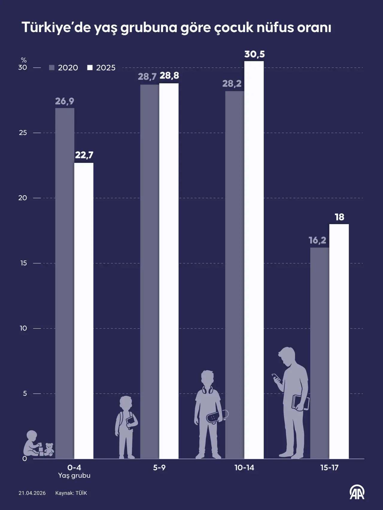 Aynı dönemde 5-9 yaş grubunda yer alan çocukların oranında ise sınırlı bir değişim yaşandı. 2020'de yüzde 28,7 olan bu oran, 2025 yılında küçük bir artışla yüzde 28,8 olarak kaydedildi. Bu veriler, 5-9 yaş aralığının toplam çocuk nüfusu içindeki ağırlığını koruduğunu gösterdi.