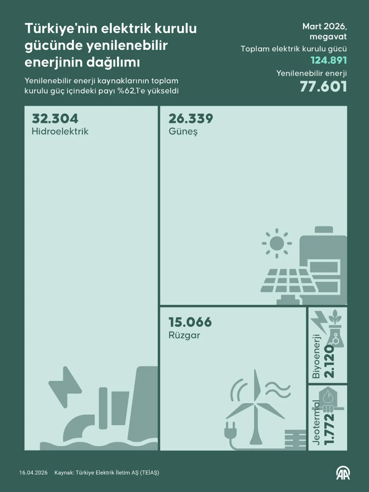 Türkiye'nin elektrik kurulu gücündeki toplam yenilenebilir enerji kapasitesi, mart ayı sonu itibarıyla 77 bin 601 megavata ulaştı. Bu kapasitenin alt dalları incelendiğinde; hidroelektrik santrallerin 32 bin 304 megavat ile en büyük dilimi oluşturduğu görülüyor. Diğer yenilenebilir kaynaklar arasında ise biyokütle enerjisi 2 bin 120 megavat, jeotermal enerji ise 1772 megavat kurulu güç ile yer alıyor. Güneş, rüzgar, hidroelektrik, jeotermal ve biyoenerjinin birleşimiyle oluşan toplam yenilenebilir enerji payı, geçen yılın mart ayında yüzde 60 iken bu yıl yüzde 62,1 olarak kayıtlara geçti.