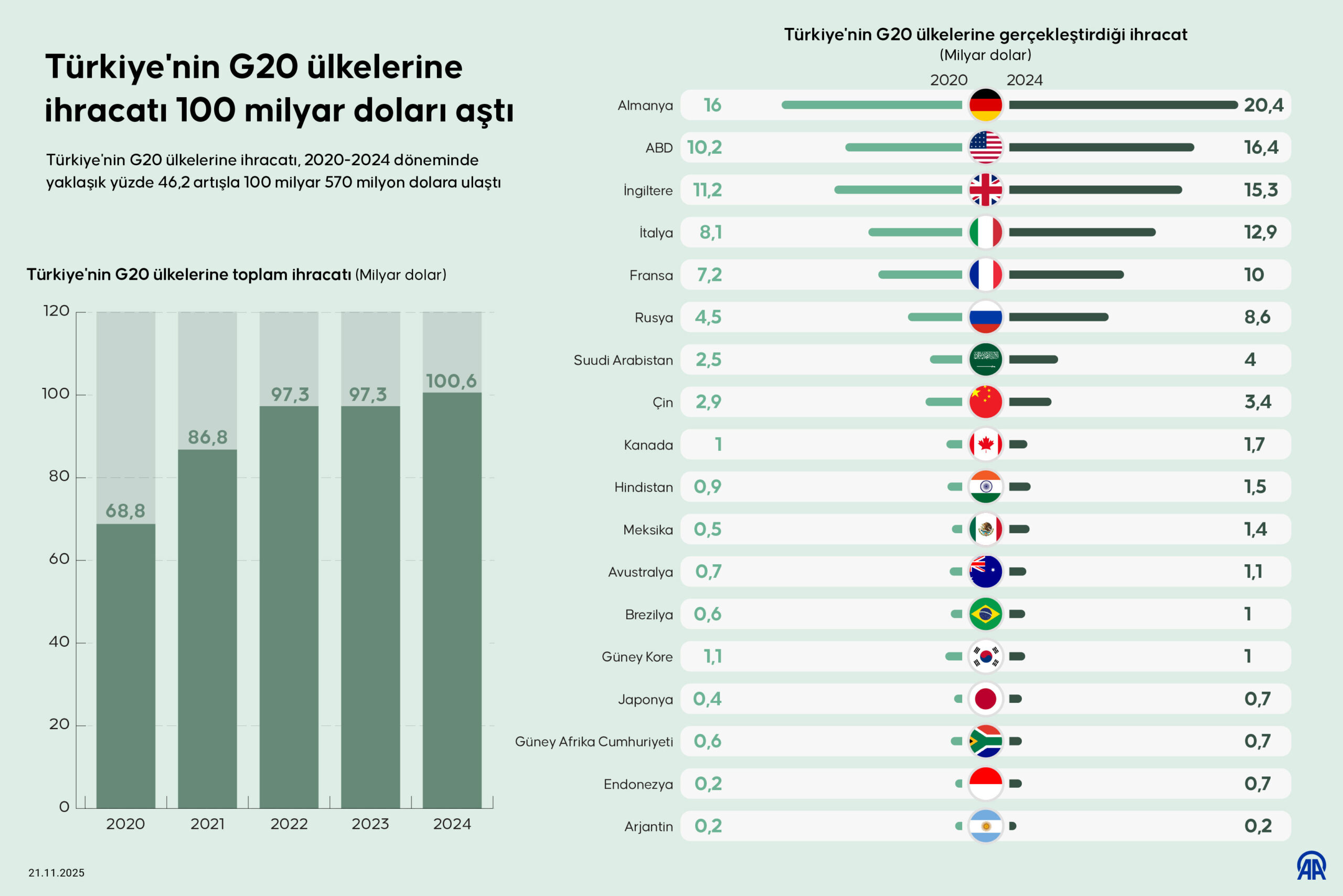 Türkiye'nin G20'ye üye ülkelere ihracatı geçen yıl 100 milyar 570 milyon doları buldu. Böylece Türkiye'nin bu ülkelere ihracatı 2020-2024 döneminde yüzde 46,2 artış gösterdi ve 100 milyar doları aştı. Bu yılın 9 ayında da söz konusu 18 ülkeye 75 milyar 607 milyon dolarlık ürün ihracatı gerçekleştirildi.