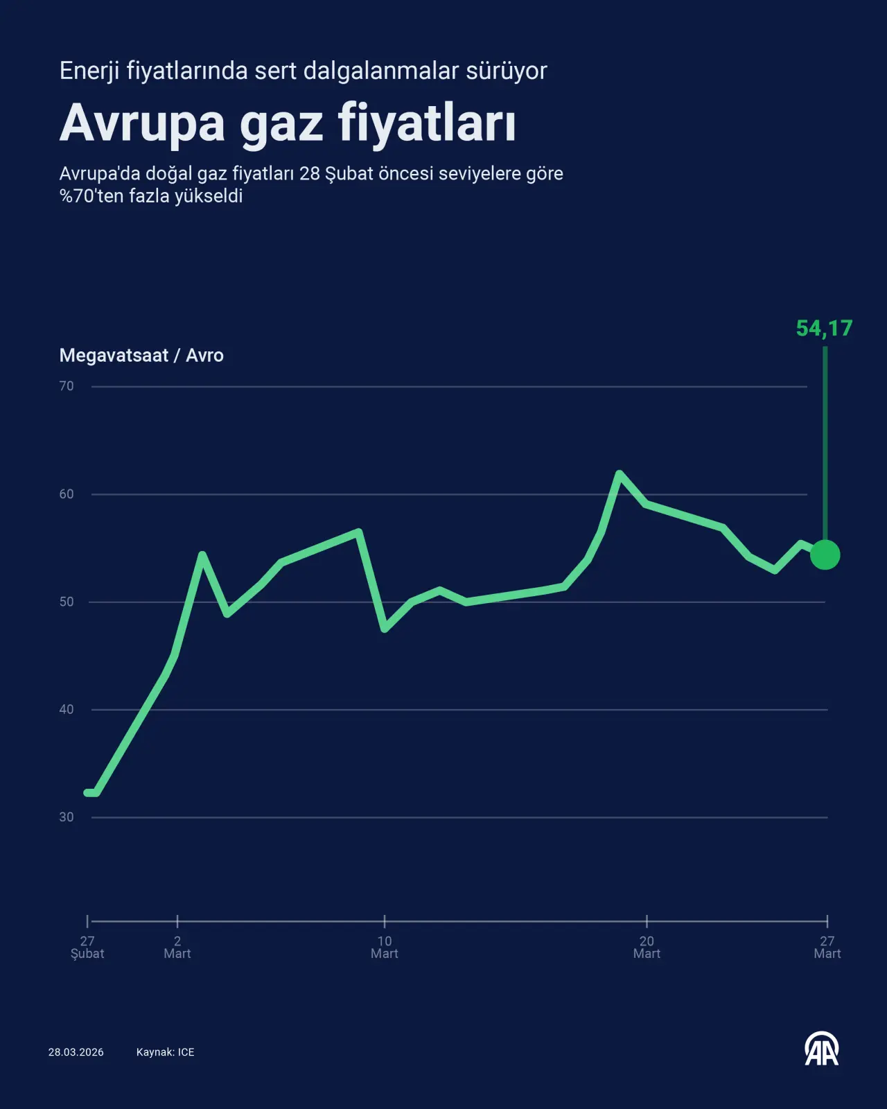20 Mart itibarıyla ise doğal gaz fiyatları savaş öncesine göre yaklaşık yüzde 85 artarak megavatsaat başına 59,2 avro seviyesine ulaştı.