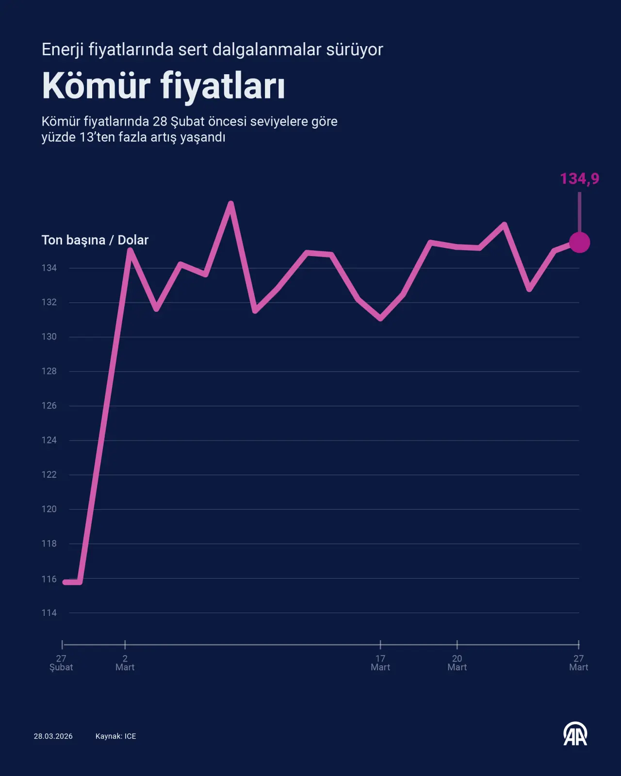 Enerji piyasalarındaki hareketlilik kömür fiyatlarına da yansıdı. Asya piyasaları için referans kabul edilen Newcastle kömür nisan vadeli kontratı, 27 Şubat’ta ton başına 118,5 dolar seviyesindeydi.