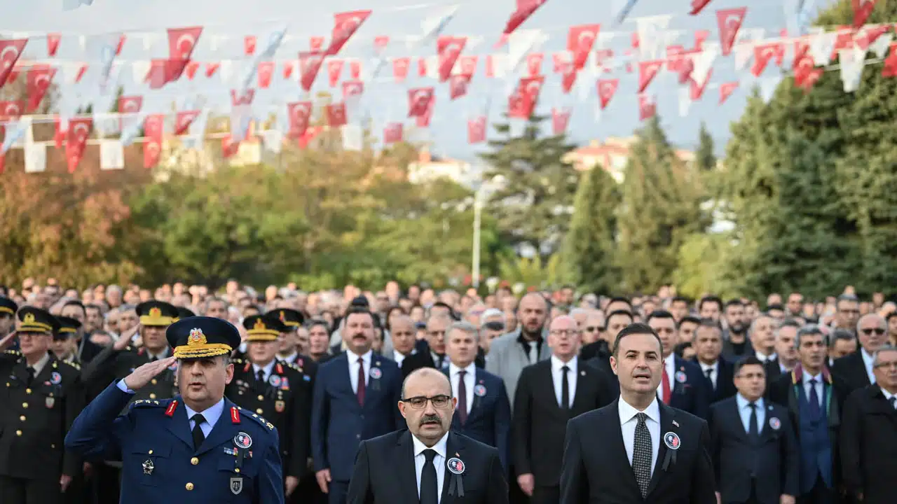 Atatürk Anıtı’na çelenklerin sunulmasıyla başlayan törende, saatler 09.05’i gösterdiğinde 2 dakikalık saygı duruşunda bulunuldu. İstiklal Marşı’nın okunmasıyla bayraklar yarıya indirildi.