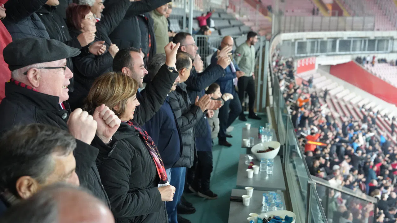 Taraftarlar stadyuma gelen Başkan Ünlüce’yi “Hiç durmadan yürü, bu şehir seninle, seviyoruz seni Ayşe Ünlüce!” bestesiyle karşıladılar.