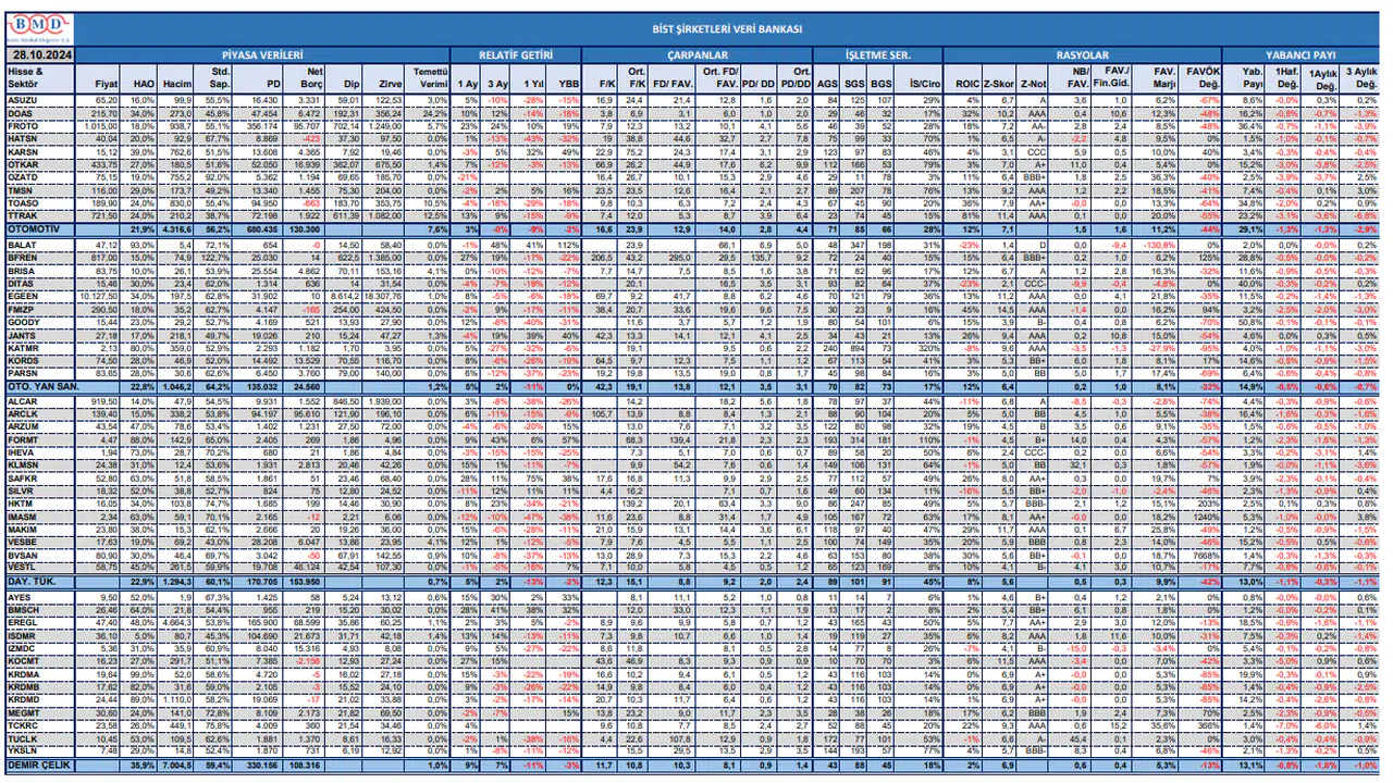 BMD Araştırma’nın raporuna göre, Borsa İstanbul’da işlem gören şirketlerin sektörleri, halka açıklık oranı, ortalama hacim, son bir yıllık dip ve zirve fiyatları gibi piyasa verilerini; BİST 100 endeksine göre göreceli getirilerini; F/K, FD/FAVÖK ve PD/DD çarpanlarının cari ve ortalama değerlerini; alacak stok ve borç gün süreleri ile işletme sermayesi/ciro oranını; ROIC, Z-Skor, Net Borç/FAVÖK gibi rasyoları ve yabancı payı değişimlerini gösteren veri bankası ekte yer alıyor.