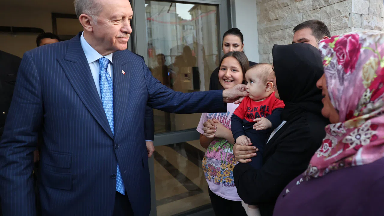Cumhurbaşkanı Recep Tayyip Erdoğan, Çevre, Şehircilik ve İklim Değişikliği Bakanı Murat Kurum ile birlikte Hatay'da Anahtar Teslimi, Kura Çekimi ve Toplu Açılış Töreni sonrası evi teslim edilen bir aileye ziyaret etti.