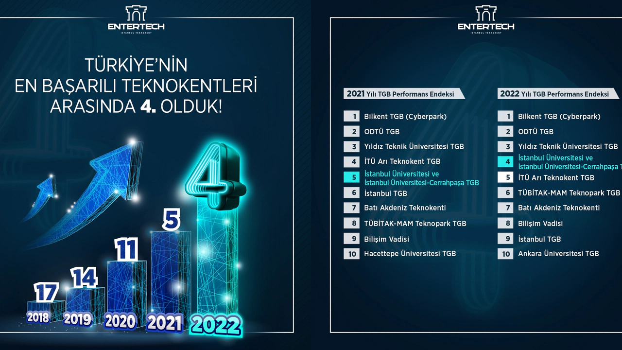 Entertech İstanbul Teknokent, Teknoloji Geliştirme Bölgeleri (TGB) Performans Endeksi'nde istikrarlı yükselişini sürdürüyor. T.C. Sanayi ve Teknoloji Bakanlığı tarafından açıklanan 2022 yılı TGB Performans Endeksi'ne göre, İstanbul Üniversitesi ve İstanbul Üniversitesi-Cerrahpaşa'nın ortak teknokenti olan Entertech İstanbul Teknokent, Türkiye'nin en iyi teknokentleri arasında 4'üncü oldu. İstanbul'daki teknokentler arasında ise 2'nci sırada yer alan Entertech İstanbul Teknokent, bu başarısıyla yıllar içindeki yükselişini bir kez daha kanıtladı. Entertech, TGB Endeksi'nin 2018'deki listesinde 17'nci, 2019'da 14'üncü, 2020'de 11'inci ve 2021'de 5'inci sırada yer almıştı.