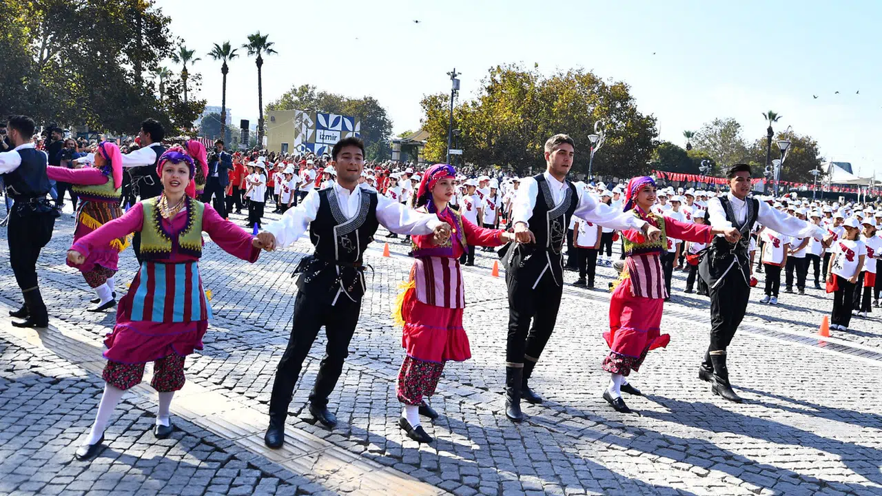 Kutlamalar, çelenk programının ardından İzmir Valiliği önünde devam etti. Programa İzmir Büyükşehir Belediye Başkanı Dr. Cemil Tugay’ı temsilen Başkan Vekili Dr. Zafer Levent Yıldır katıldı. Programda halk oyunları gösterileri ve öğrencilerin Cumhuriyet temalı koreografisi ilgi topladı. Vali Elban’a el dokuması Türk Bayrağı teslim edildi. Tören sonunda protokol ve İzmirli minikler birlikte hatıra fotoğrafı çektirdi.