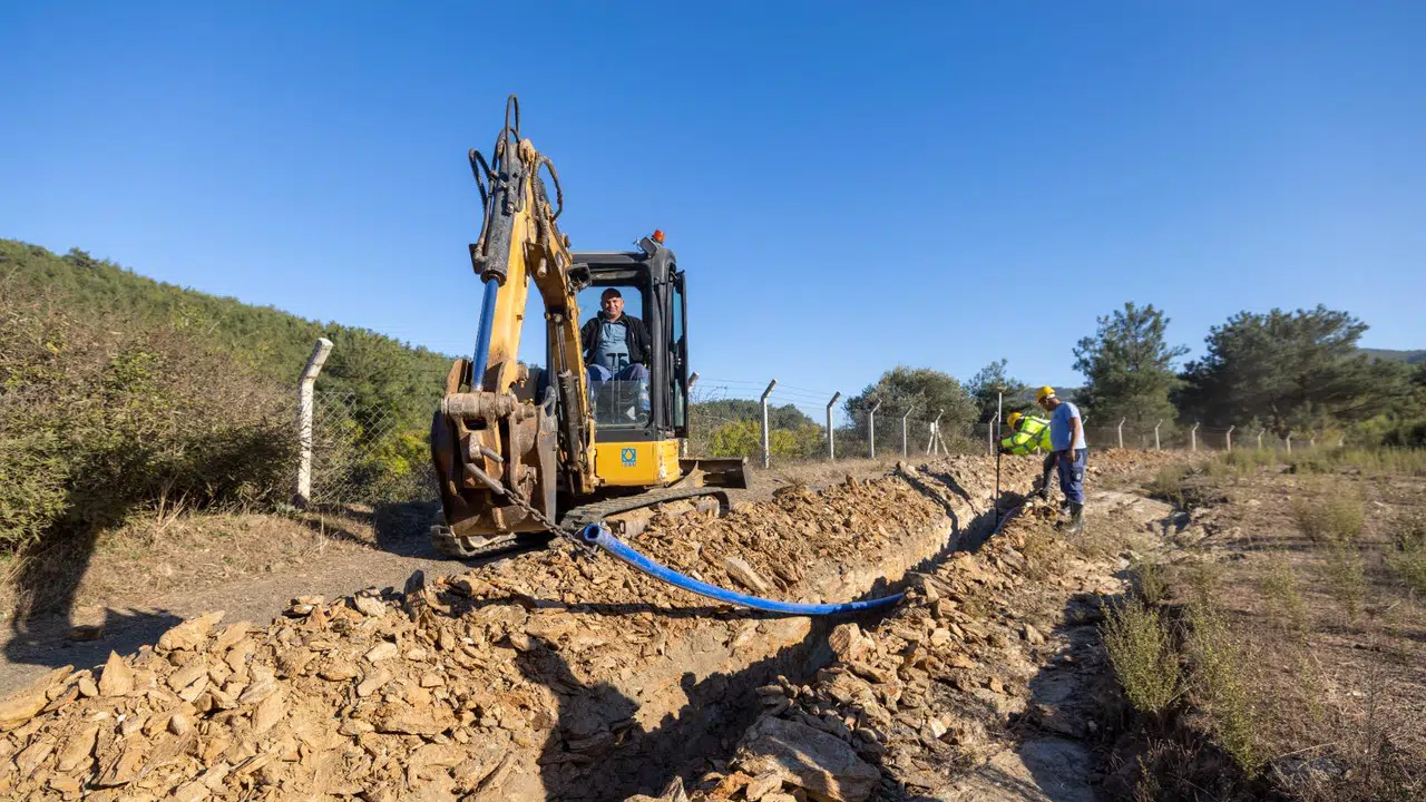 Menderes’teki 6 mahallenin içme suyu ihtiyaçlarının yüzde 47.5 lik kısmını yerüstü kaynaklardan karşılamak, kuyu ve pompa enerji sarfiyatlarını en aza indirmek amacıyla çalışmalara devam ettiklerini ifade eden İZSU Menderes Teknik Amiri Mehmet Üstdağ, “Menderes Ataköy Mahallesi Karacadağ mevkiinde bulunan kaynak suyunu 19 kilometrelik hatla Menderes’in 6 mahallesine taşıyacağız. Zorlu şartlarda yapılan çalışmalar tamamen kurumumuzun imkânlarıyla yapılıyor. 2025 yılının ilk çeyreğinde çalışmalar tamamlanacak. Bu mahallelerin içme suyu temini14 kuyudan sağlanıyor. İletim hattının döşenmesiyle birlikte 7 kuyumuz bu mahallelere hizmet verecek, böylece enerji tasarrufu sağlayacağız” dedi.
