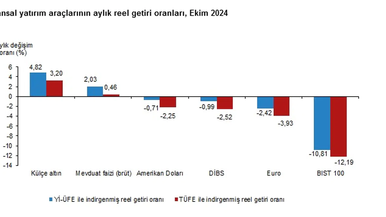 Türkiye İstatistik Kurumu'nun (TÜİK) verilerine göre, Ekim’de en yüksek reel getiri, yurt içi üretici fiyat endeksi (Yİ-ÜFE) ile indirgendiğinde yüzde 4,82, tüketici fiyat endeksi (TÜFE) ile indirgendiğinde ise yüzde 3,20 oranlarıyla külçe altında gerçekleşti.