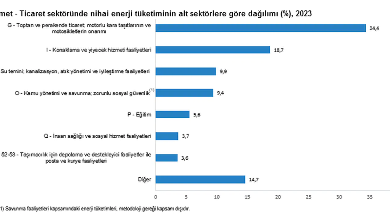 Alt sektörler itibariyle nihai enerji tüketiminde en büyük payı, yüzde 34,4 ile "toptan ve perakende ticaret; motorlu kara taşıtlarının ve motosikletlerin onarımı" sektörü aldı. Bu sektörü sırasıyla, yüzde 18,7 ile "konaklama ve yiyecek hizmeti faaliyetleri" ve yüzde 9,9 ile "su temini; kanalizasyon, atık yönetimi ve iyileştirme faaliyetleri" sektörleri takip etti.