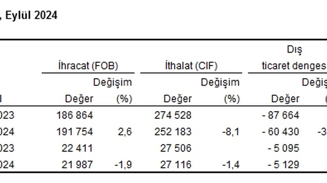 Türkiye İstatistik Kurumu ile Ticaret Bakanlığı iş birliğiyle genel ticaret sistemi kapsamında üretilen geçici dış ticaret verilerine göre; ihracat 2024 yılı Eylül ayında, yıllık bazda yüzde 1,9 azalarak 21 milyar 987 milyon dolara, ithalat yüzde 1,4 azalarak 27 milyar 116 milyon dolara düştü.