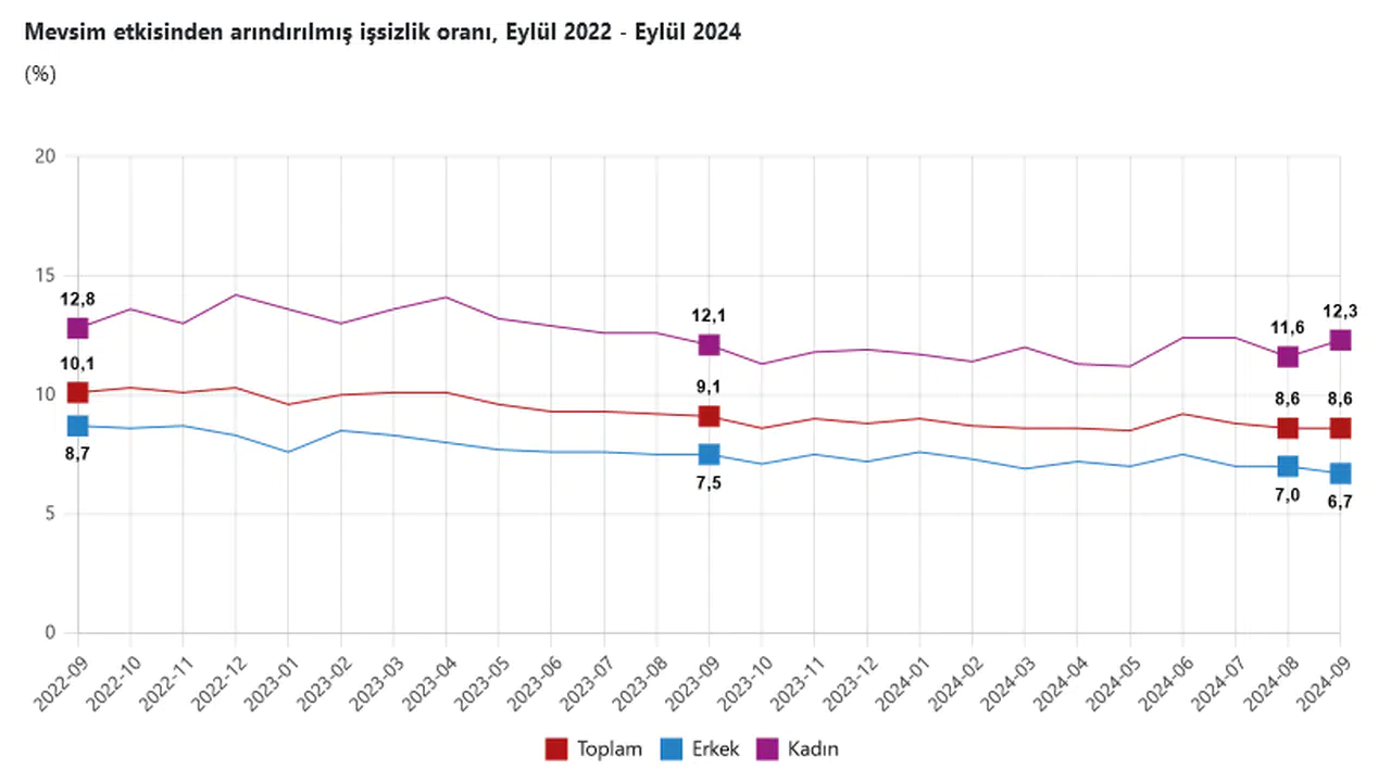 Türkiye İstatistik Kurumu'nun (TÜİK) verilerine göre, Hanehalkı İşgücü Araştırması sonuçlarına göre; 15 ve daha yukarı yaştaki kişilerde işsiz sayısı Eylül ayında bir önceki aya göre 35 bin kişi artarak 3 milyon 100 bin kişi oldu.