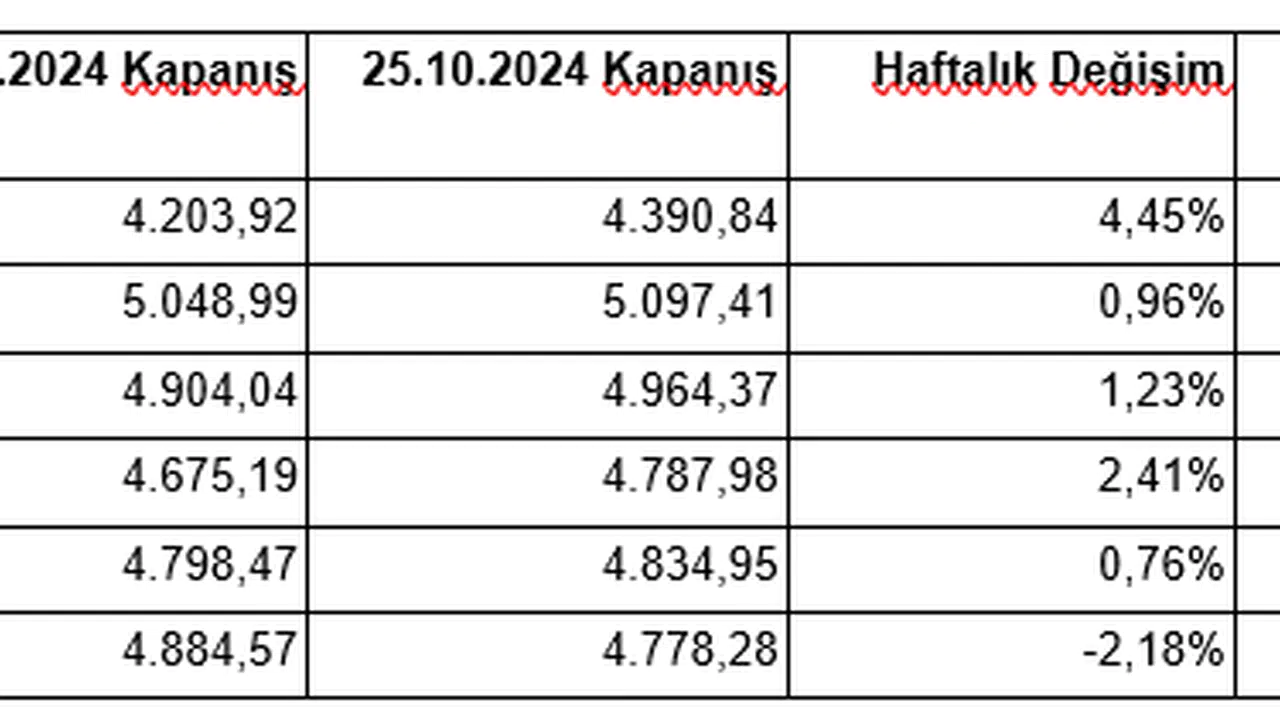 TÜRİB Mısır Endeksi: 21 Ekim Pazartesi 4.884,57 seviyesinde, 25 Ekim Cuma günü ise 4.778,28 seviyesinde kapanmıştır. Haftalık değişim -%2,18, yıllık değişim %59,10 olmuştur."