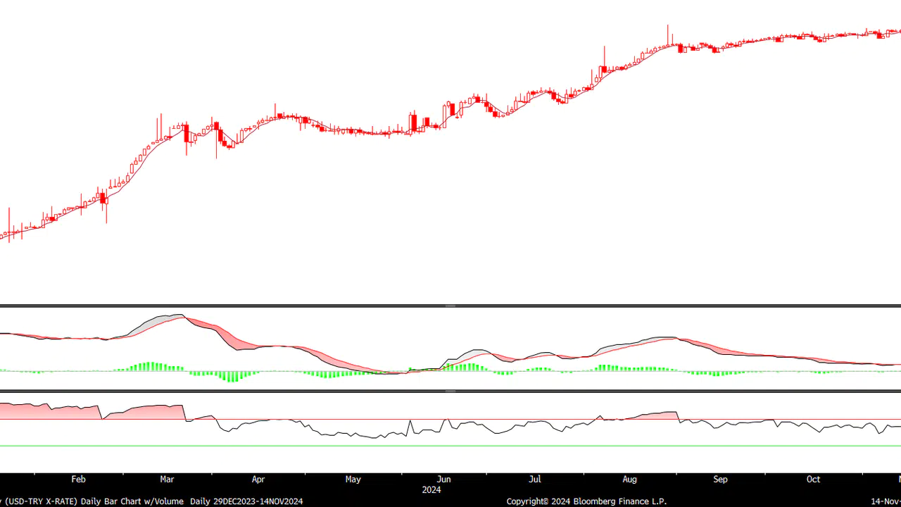 "USD/TRY: Yurtdışı piyasalarda dün beklentilere paralel gelen ABD enflasyon verisi sonrasında Fed'e yönelik indirim beklentileri biraz artarken, Fed üyelerinden temkinli açıklamalar gelmeye devam etti. ABD endeksleri ise yatay sayılabilecek bir görüntüyle günü tamamladı. Öte yandan, Dolar yükselişini sürdürdü. Dolar endeksi (DXY) yüzde 0,4 oranında yükselerek 106,5 seviyesine kadar çıktı. Cumhuriyetçilerin, Senato'nun ardından Temsilciler Meclisi'ni de kazandığının netleşmesinin ardından Dolar'da yukarı yönlü hareket bu sabah da devam ederken, risk iştahı zayıf. Yurtiçinde ise 5 yıllık risk primimiz 256 baz puan seviyesinde yatay seyretmeye devam ederken, Dolar/TL tarafında önemli bir hareketlilik yok. Kur 34,40 seviyesinin hafif altında işlem görmeye devam ediyor. Günün geri kalanında da bu eğilim sürebilir. Bugün yurtiçinde haftalık para ve banka istatistikleri takip edilecek. Yurtdışında ise ABD'de ekim ayı ÜFE verisi, haftalık yeni işsizlik maaşı başvuruları ve Powell'ın konuşması ajanda yer alıyor.