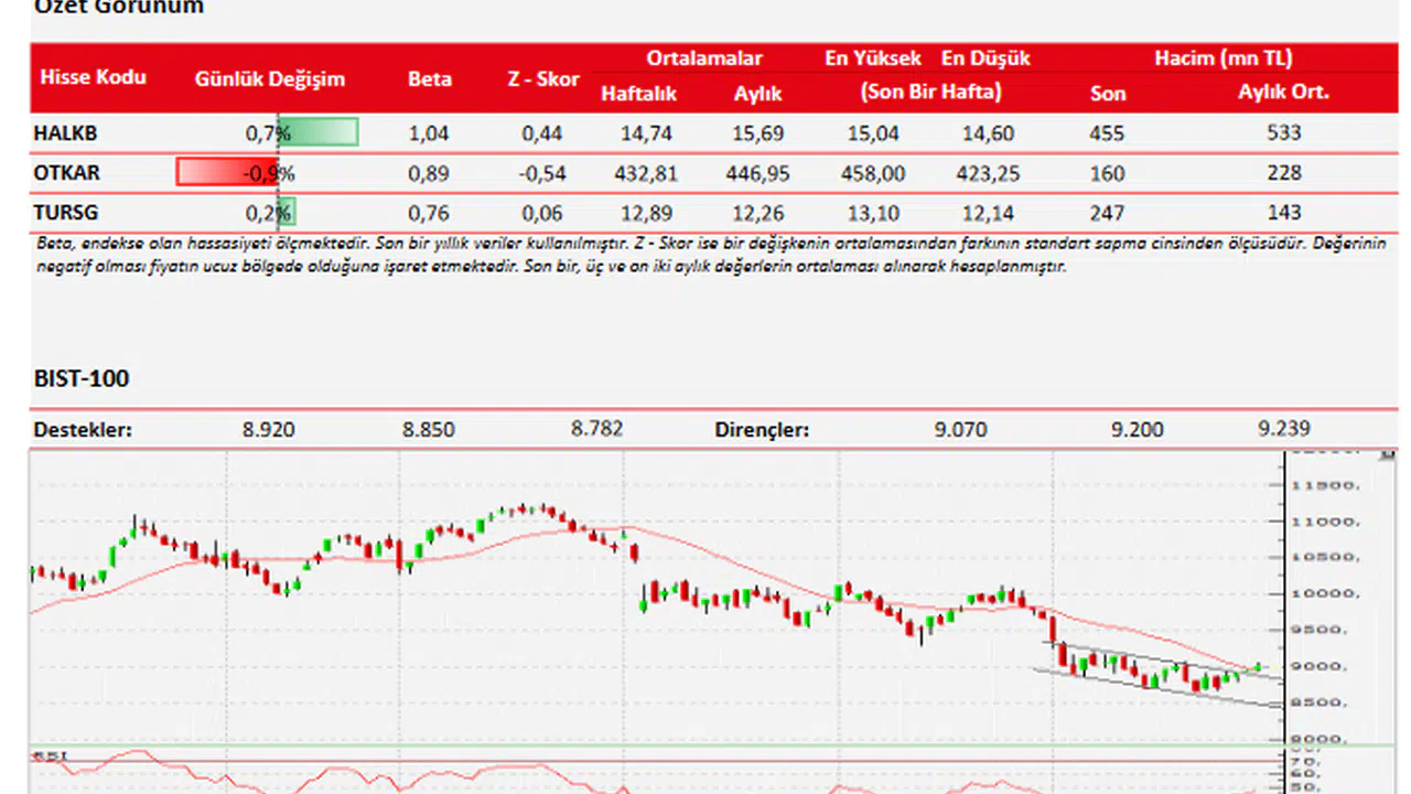 “Arka arkaya dördüncü işlem gününü de pozitif bölgede tamamlayan endekste Bankacılık Endeksi (XBANK) yükselişe öncülük ederken hacim de yakın dönem ortalamalarının üzerinde seyretmeye devam etti. Kısa vadeli göstergelerdeki yukarı yönlü potansiyel dikkat çekerken, 9.250 yakın destek bölgesi önemli. Endekste bu seviyenin üzerinde kalıcılık sağlandıkça kısa vadeli yükseliş ivmesi sürebilir. Endeksin güne yatay bir görüntüyle başlamasını bekliyoruz.”