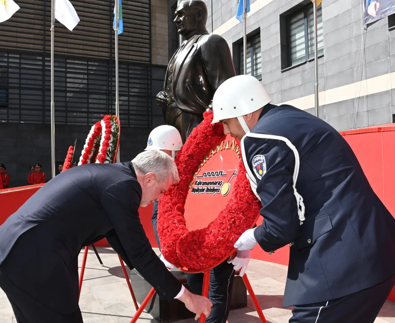 Kutlama programı, protokol üyelerinin Atatürk Anıtı’na çelenk sunmasıyla başladı. Törene Kahramanmaraş Valisi Mükerrem Ünlüer, AK Parti Kahramanmaraş Milletvekili Tuba Köksal, Garnizon Komutanı Tuğgeneral Mahmut Sert ve Büyükşehir Belediye Başkanı Fırat Görgel katıldı. Ayrıca Cumhuriyet Başsavcısı Ramazan Murat Tiryaki, Kahramanmaraş Sütçü İmam Üniversitesi (KSÜ) Rektörü Prof. Dr. İbrahim Taner Okumuş, Onikişubat Kaymakamı Salih Çiğdem, Dulkadiroğlu Kaymakamı Hicabi Aytemür ve Onikişubat Belediye Başkanı Hanifi Toptaş da törende hazır bulunan isimler arasındaydı. Çelenklerin sunulmasının ardından, katılımcılar tarafından saygı duruşunda bulunuldu ve İstiklal Marşı okundu.
