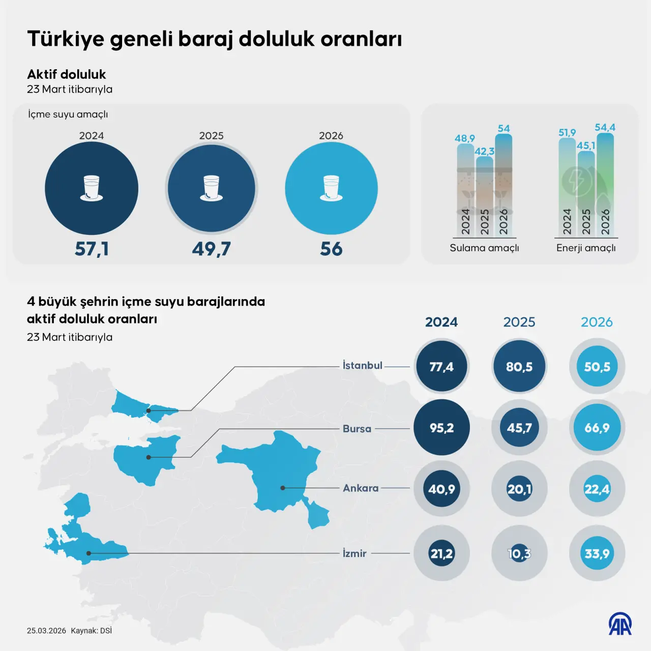 Büyükşehirlerdeki baraj doluluk oranları ise şehir bazlı farklılık gösterdi. İstanbul’da doluluk oranı geçen yıl yüzde 80,5 seviyesindeyken bu yıl yüzde 50,5’e geriledi. Mevcut seviyeye göre kentte yaklaşık 156 günlük içme suyu bulunuyor.